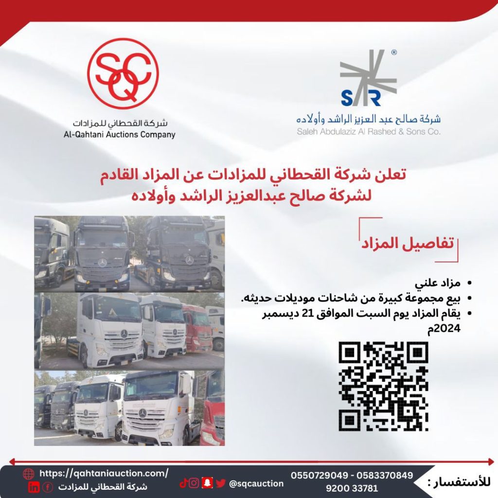 تعلن شركة القحطاني للمزادات عن مزادها القادم لشركة صالح عبدالعزيز الراشد وأولاده