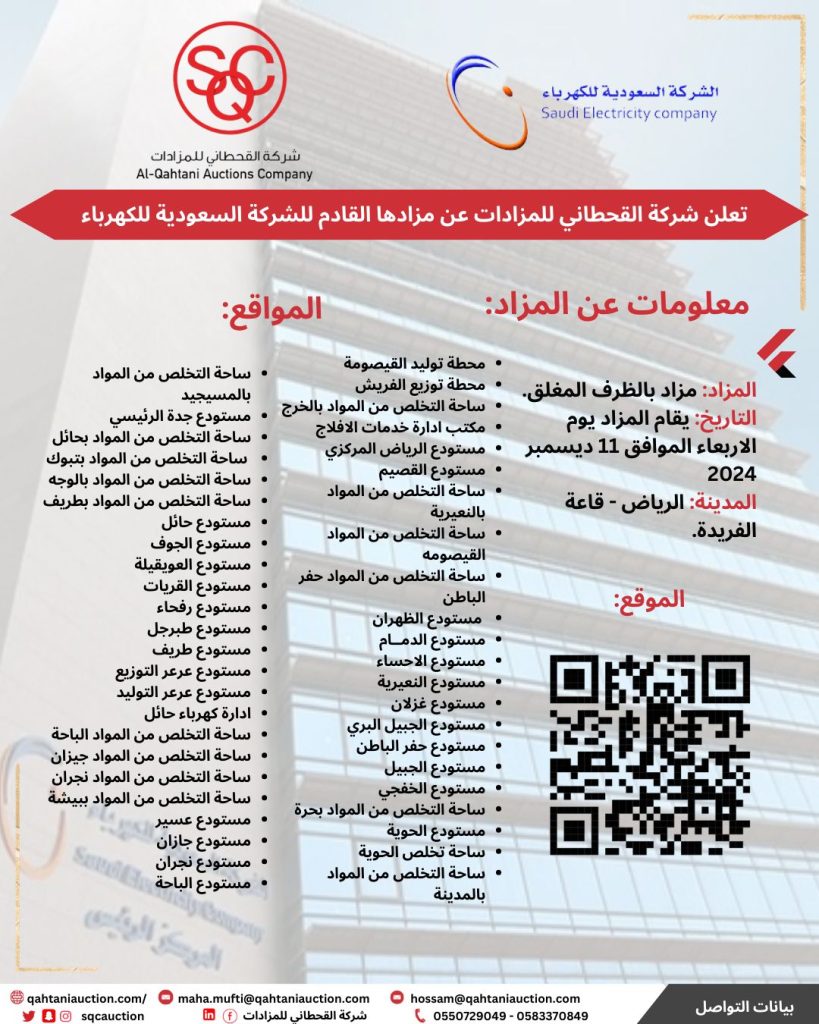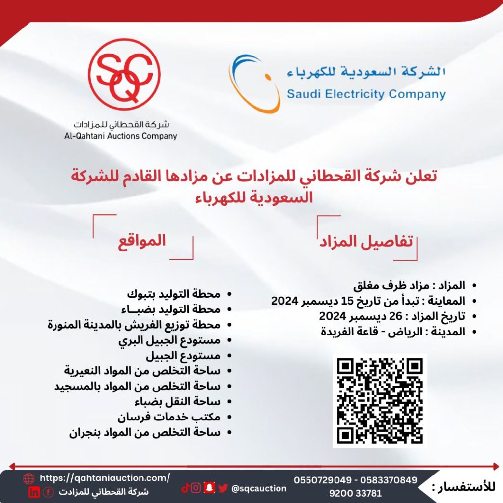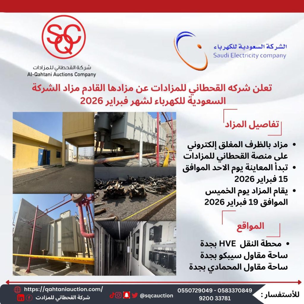 تعلن شركة القحطاني للمزادات عن مزادها القادم للشركة السعودية للكهرباء