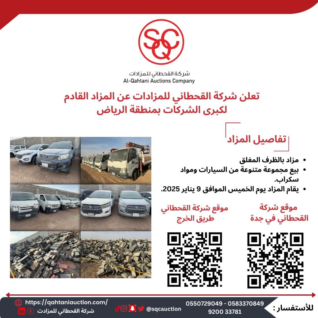 تعلن شركة القحطاني للمزادات عن مزادها القادم لكبرى الشركات بمنطقة الرياض