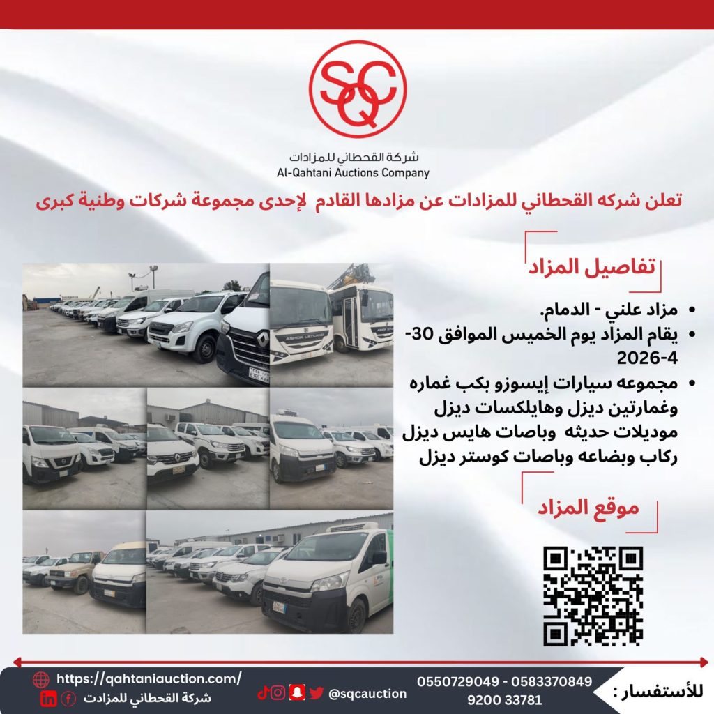 تعلن شركة القحطاني للمزادات عن مزادها القادم لإحدى كبرى الشركات الوطنية