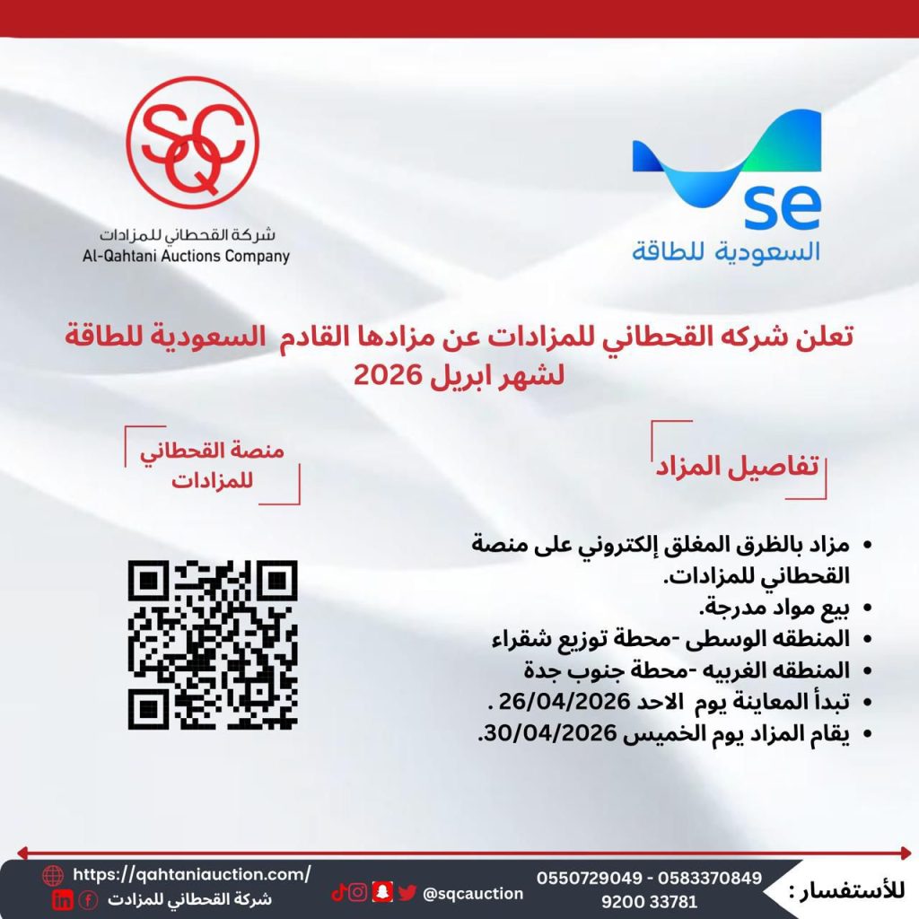 تعلن شركة القحطاني للمزادات عن مزادها القادم السعودية للطاقة لشهر أبريل 2026