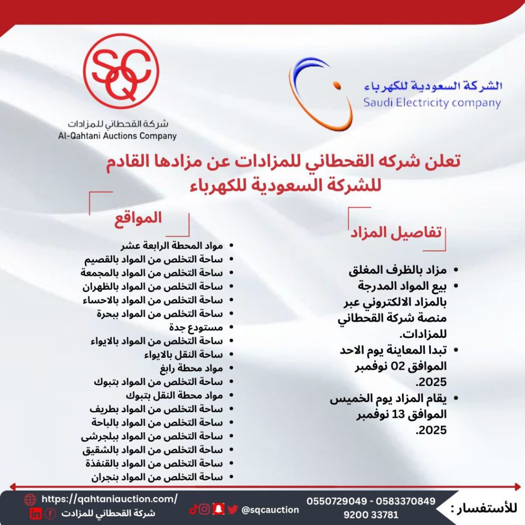 Al-Qahtani Auction Company is pleased to announce its upcoming auction for the Saudi Electricity Company.