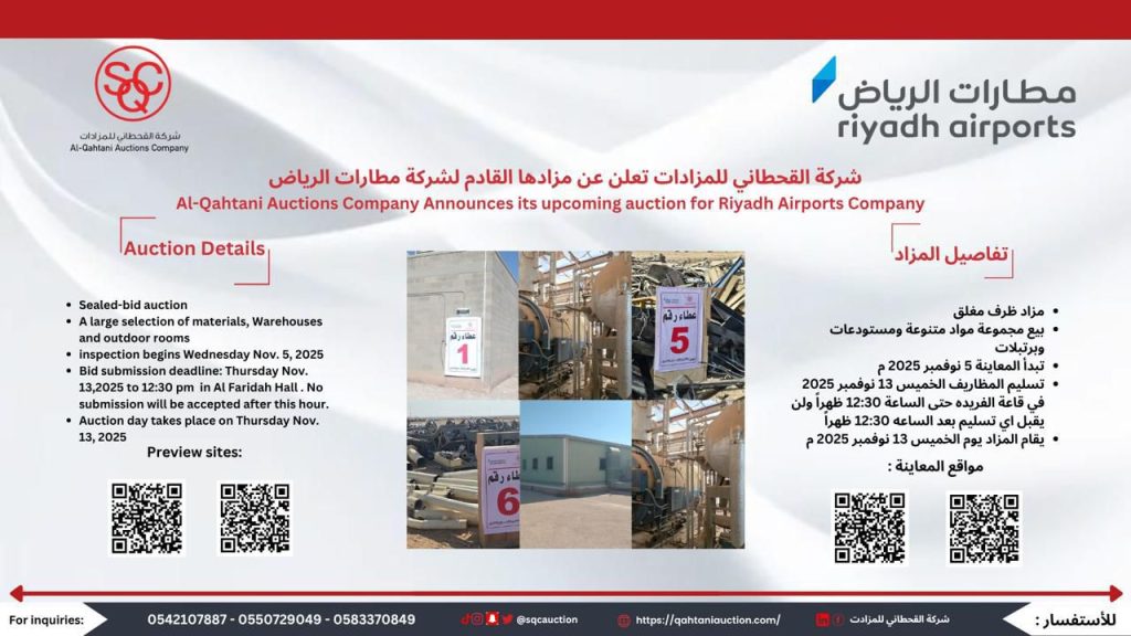 Al-Qahtani Auction Company is pleased to announce its upcoming auction for Riyadh Airports Company.